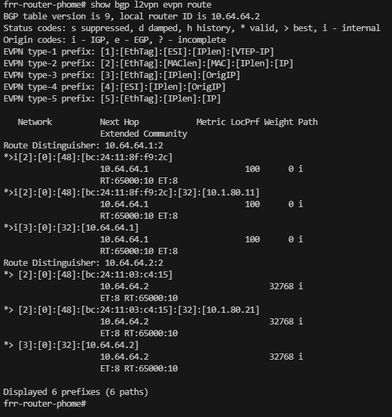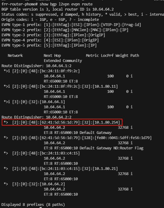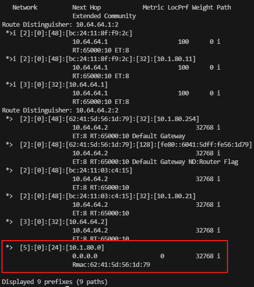 network 10.1.80.0/24 rd 10.64.64.2:2 ethtag 0 label 0 esi 00:00:00:00:00:00:00:00:00:00 gwip 10.1.80.254 routermac 62:41:5d:56:1d:79