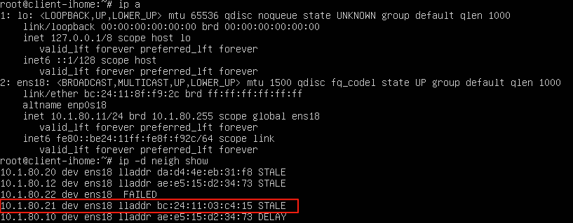 这里的10.1.80.11和10.1.80.21是用来测试的客户端。这个时候两侧vlan80主机已经可以通过vxlan隧道互通了,客户端主机FDB里能够看到对端子网主机MAC。